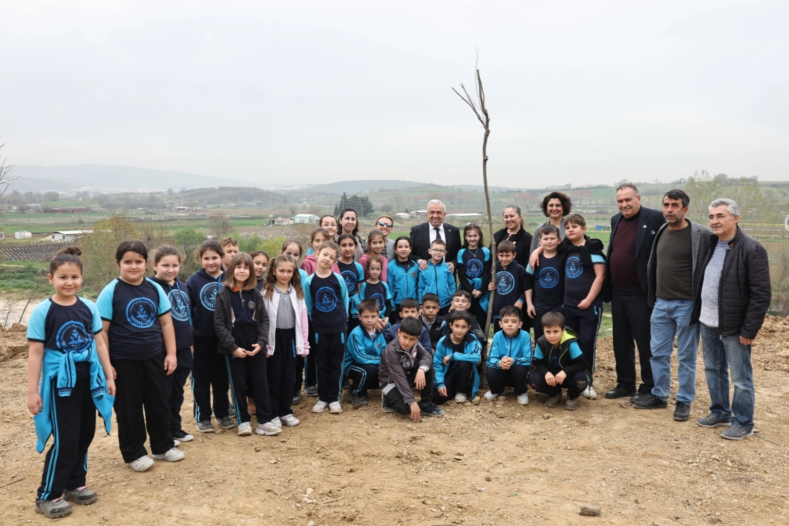 Nilüfer Belediye Başkanı Şadi Özdemir de alanda gruplar halinde ayrılan çocuklarla birlikte, çınar fidanlarını toprakla buluşturdu.