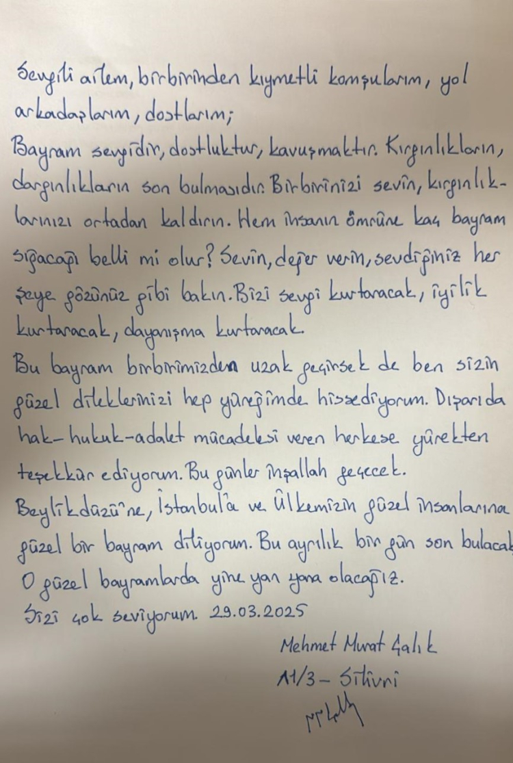 Öte yandan Beylikdüzü’nün seçilmiş Belediye Başkanı Mehmet Murat Çalık ise tutuklu bulunduğu Marmara Cezaevi’nden avukatları aracılığıyla bir bayram mesajı iletti.