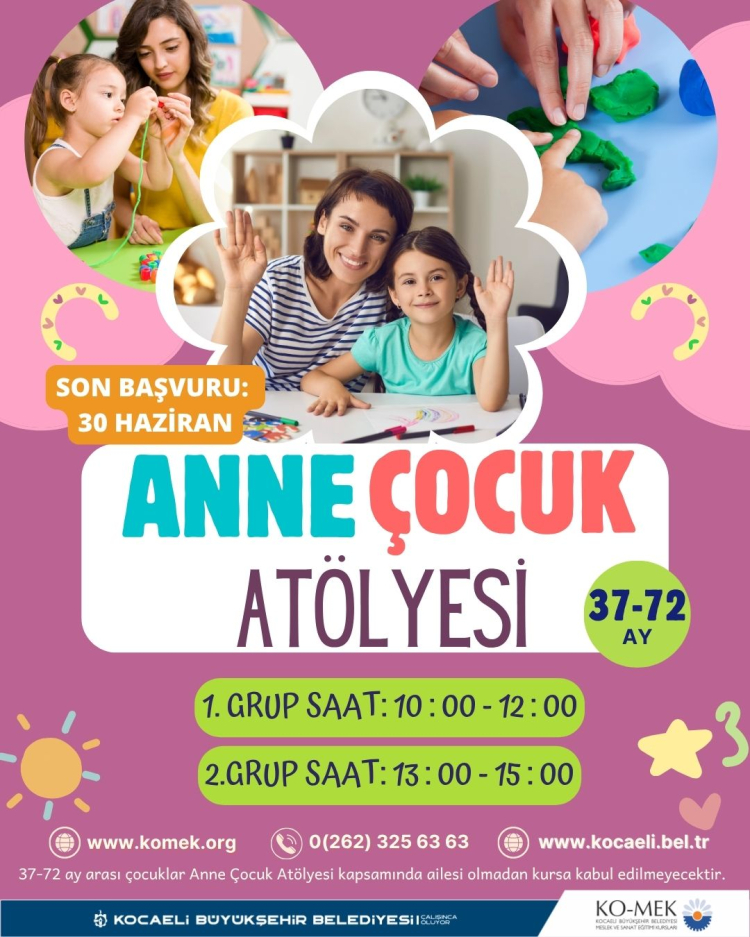 KOCAELİ (İGFA) - Kocaeli Büyükşehir Belediyesi Meslek ve Sanat Eğitim Kursları (KO-MEK), yaz dönemine özel yepyeni ve anlamlı bir projeyi hayata geçiriyor. “Anne-Çocuk Atölyesi” adlı bu proje, okul öncesi yaş grubundaki çocuklara aileleriyle birlikte eğlenerek öğrenme fırsatı sunmayı hedefliyor.