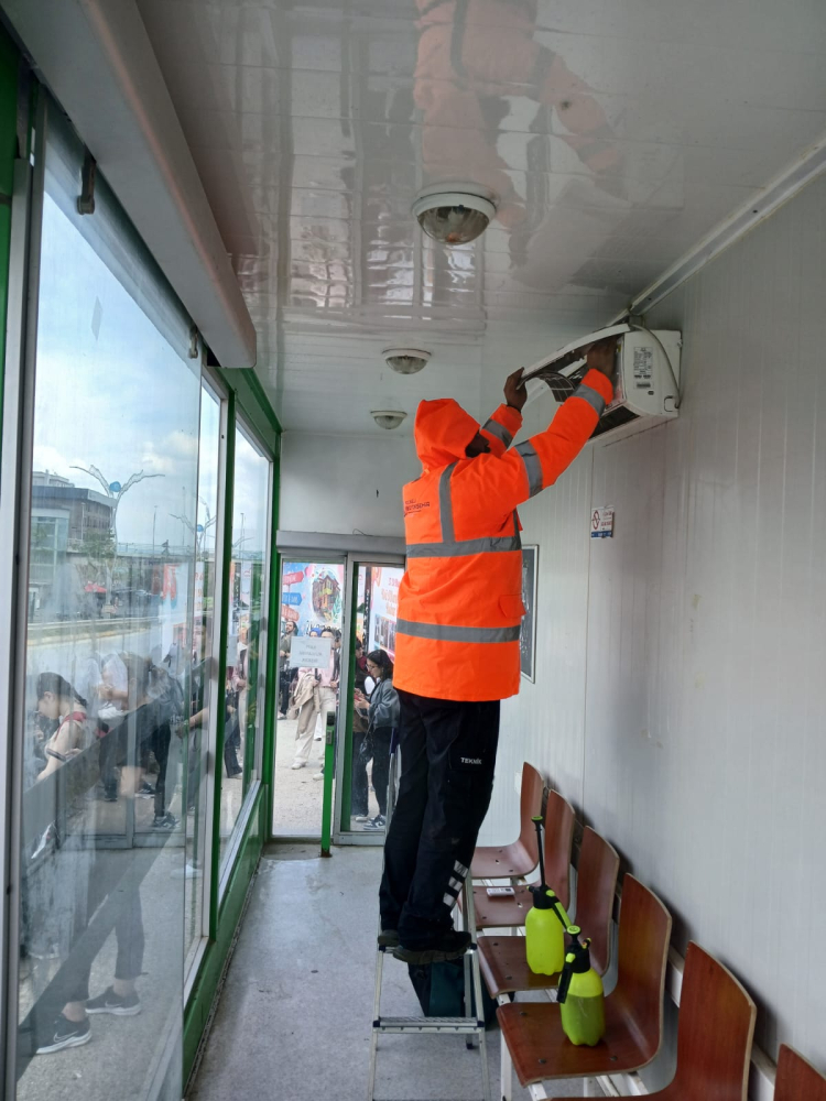 Kocaeli Büyükşehir Belediyesi ekipleri, kent genelindeki tüm duraklarda olduğu gibi Umuttepe B Kapısı’ndaki akıllı durağın klimasını da bakımdan geçirdi.