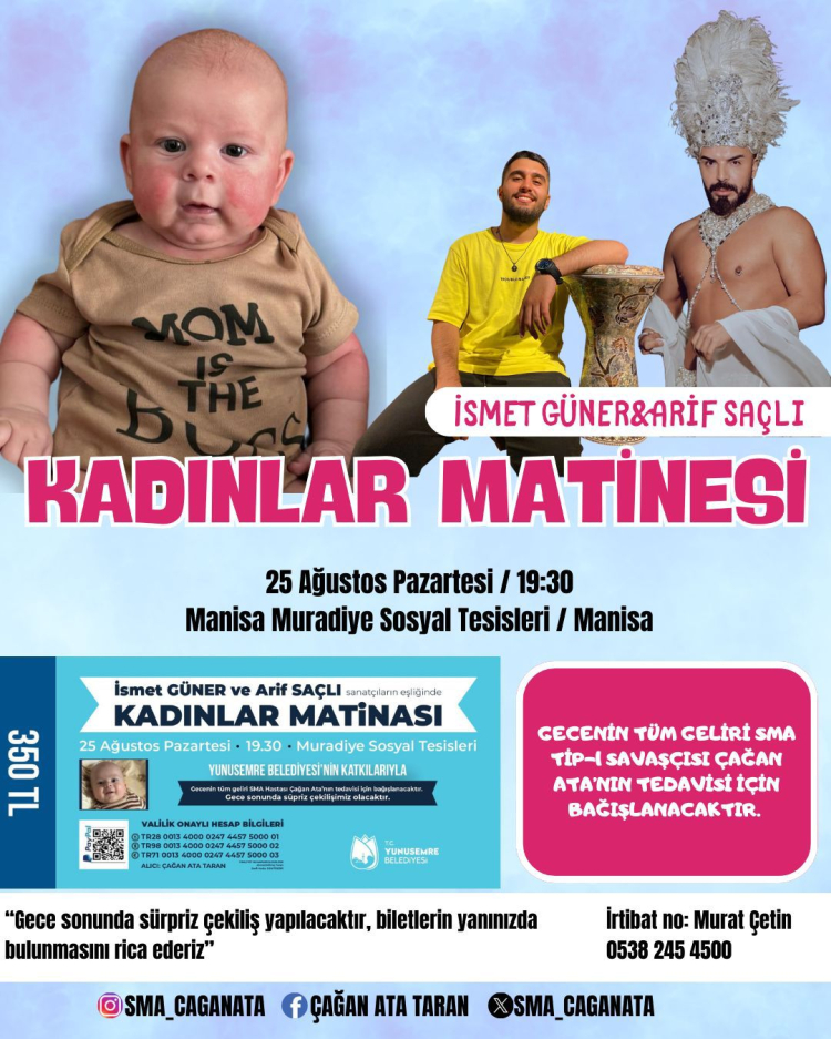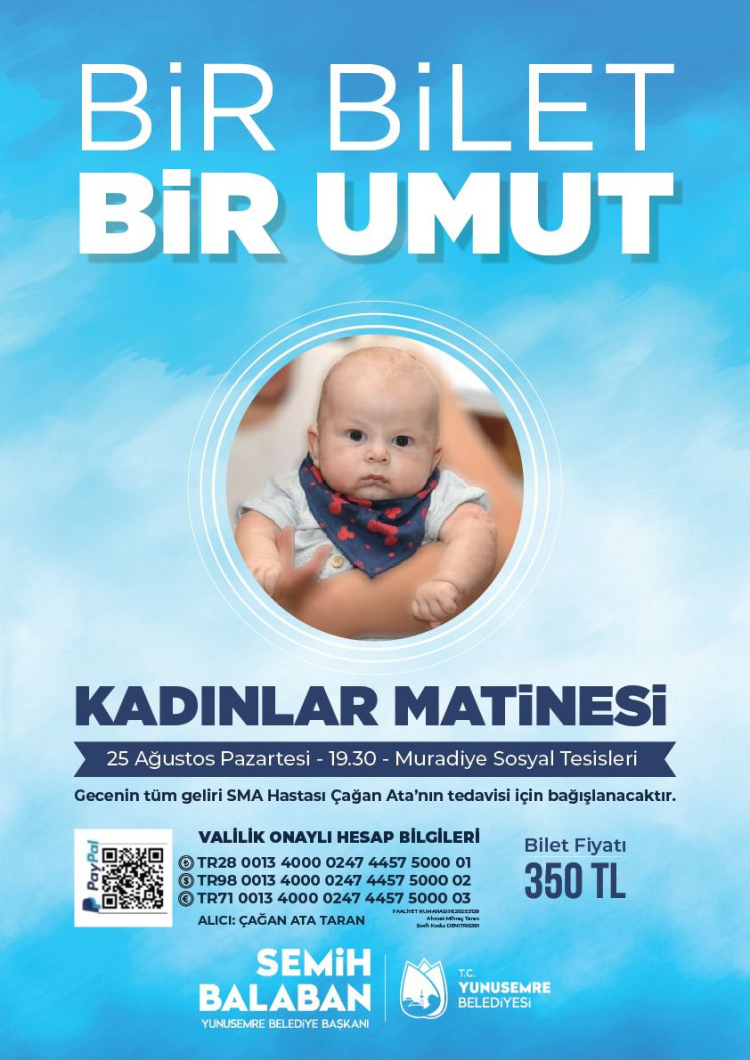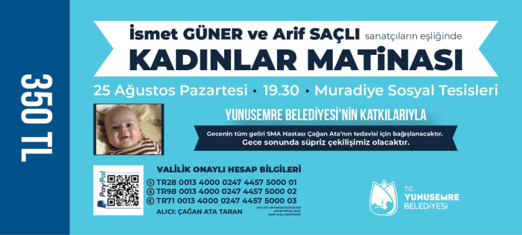 Yunusemre Belediye Başkanı Semih Balaban öncülüğünde 25 Ağustos Pazartesi saat 19.30’da Muradiye Sosyal Tesisleri’nde Kadınlar Matinesi düzenlenecek. Kadınlar Matinesi'nde yerel sanatçılar İsmet Güner ile Arif Saçlı sahne alacak. 350 liralık biletler satışa sunulurken, elde edilecek gelirin tamamı Çağan Ata Taran’ın tedavisinde kullanılacak.